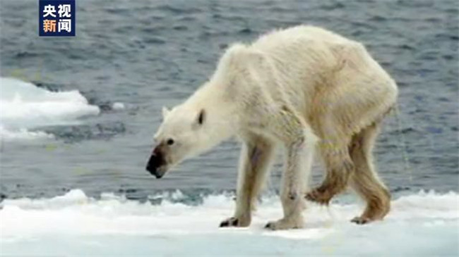 ▲圖為德國(guó)攝影師于2015年拍攝到的一只瘦骨嶙峋的北極熊。圖片來(lái)源:央視新聞。