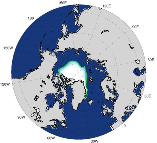 ▲中科院大氣物理研究所ANSO IAP-LASG北極海冰動(dòng)力集合預(yù)測(cè)系統(tǒng)6月份發(fā)布的9月份北極海冰范圍預(yù)測(cè),綠色實(shí)線為預(yù)測(cè)的北極海冰范圍,白色區(qū)域?yàn)楹1鶇^(qū)域。圖片來(lái)源:中國(guó)科學(xué)報(bào)