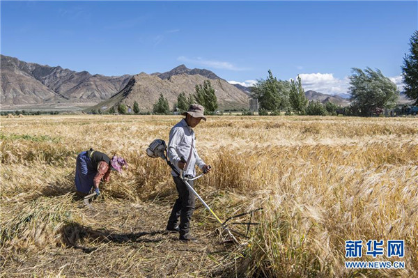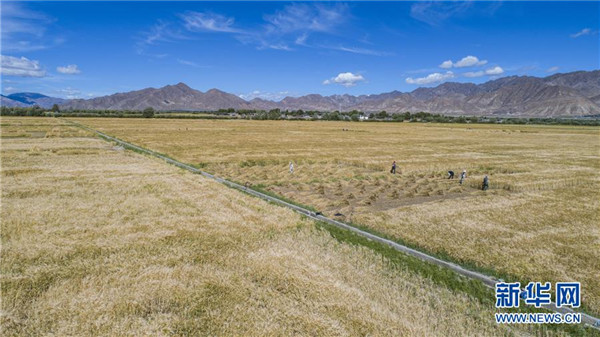 8月29日,農(nóng)民在日喀則市江孜縣的青稞田里忙收割。日喀則是西藏重要的商品糧基地,被譽(yù)為“西藏糧倉”。當(dāng)前正值青稞收獲季節(jié),當(dāng)?shù)剞r(nóng)民抓緊收割,農(nóng)田里一片繁忙景象。新華社記者孫非攝