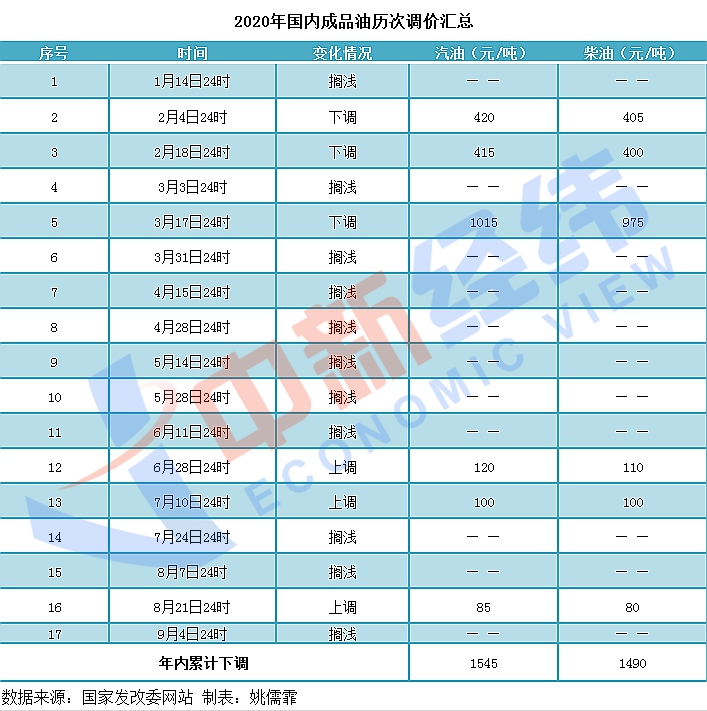 據(jù)中新經(jīng)緯客戶端統(tǒng)計,2020年以來國內(nèi)成品油調(diào)價已進(jìn)行了十七輪,具體為上調(diào)三次、下調(diào)三次,擱淺十一次,汽油總計下調(diào)了1545元/噸,柴油總計下調(diào)了1490元/噸。其中,3月31日至6月11日的6輪調(diào)整均因國際市場原油價格低于40美元/桶而擱淺。如果本輪成品油調(diào)價下調(diào),2020年國內(nèi)成品油調(diào)價將呈現(xiàn)“三漲四跌十一擱淺”的格局。