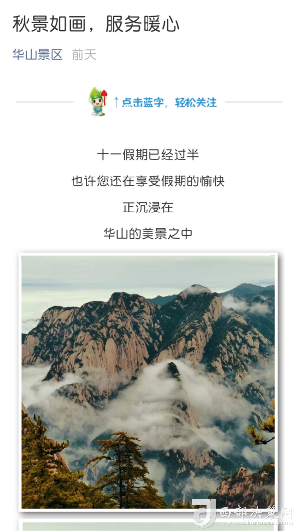 9月30日至10月8日期間,景區(qū)官方微信以歡度雙節(jié)、防疫安全、熱心服務(wù)、旅游攻略等為主題發(fā)布宣傳軟文23篇,累計閱讀量4.2萬人次,分享及轉(zhuǎn)發(fā)量共計1430次;官方微博向游客及時發(fā)布景區(qū)天氣、客流、景色實況、溫馨提示等景區(qū)度節(jié)綜合信息共計102條,閱讀量高達101.9萬次,并耐心、細致解答網(wǎng)友私信、評論共計532條;通過抖音平臺發(fā)布景區(qū)公告、秋日美景、好人好事等短視頻及圖片錦集共計18條,播放量共計 1.4萬次。
