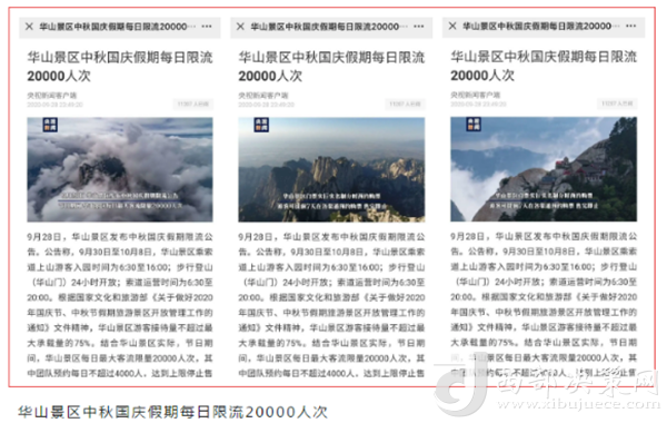 度節(jié)期間,通過央視cctv2【天下財經(jīng)】、cctv4、cctv13【新聞30分】、cctv13【新聞直播間】、央視網(wǎng)【國慶假期·出游】、央視網(wǎng)學習強國、央視新聞客戶端、新華社等國家級媒體對景區(qū)度節(jié)工作、游覽秩序、特色服務(wù)等方面進行轟炸式報道;聯(lián)合陜西日報、陜西電視臺、渭南日報、渭南電視臺、三秦都市報、陜西旅游資訊、騰訊網(wǎng)、新浪網(wǎng)、網(wǎng)易陜西、鳳凰陜西等30余家主流媒體對景區(qū)度節(jié)期間各項工作及實時風景進行跟蹤報道,共計發(fā)布各類宣傳稿件239篇,全面提升景區(qū)旅游熱度。