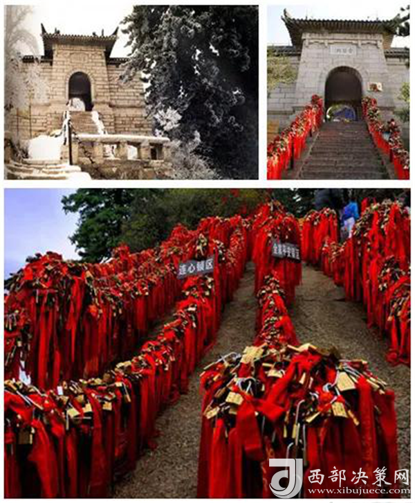 到達(dá)金鎖關(guān)時(shí),眼前大片大片的紅色,游人的視覺和心靈受到強(qiáng)烈的沖擊。這是沿路兩邊鐵鏈上綁滿的密密麻麻的紅色絲繩,不留一絲空隙,風(fēng)吹來(lái),長(zhǎng)長(zhǎng)的紅色絲繩就輕盈的舞起來(lái),如愛情牢固的臂膀,甜蜜的飛翔在華山之上。讓一把感情鎖和華山一同到地老天荒,成為一個(gè)“山無(wú)陵,天地絕,乃敢與君絕”的千古情愛神話。