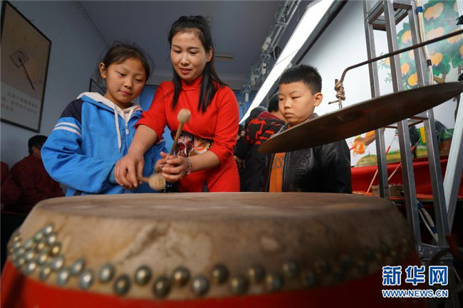 11月24日,皮影戲藝人在河北省沙河市西油村小學(xué)指導(dǎo)學(xué)生打鼓。新華社記者 范世輝 攝