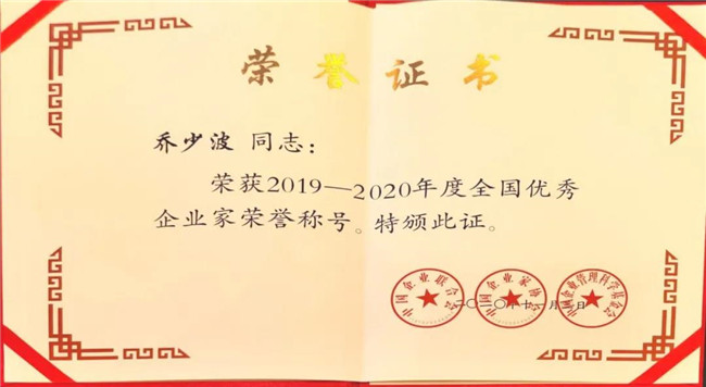 12月1日,以“弘揚(yáng)優(yōu)秀企業(yè)家精神,勇于創(chuàng)新?lián)?dāng)奉獻(xiàn)”為主題的“2020年全國(guó)企業(yè)家活動(dòng)日暨中國(guó)企業(yè)家年會(huì)”在廣東省東莞市舉行。會(huì)上表彰了154名優(yōu)秀企業(yè)家,公司董事長(zhǎng)、總經(jīng)理喬少波喜獲“2019-2020年全國(guó)優(yōu)秀企業(yè)家”稱號(hào)。