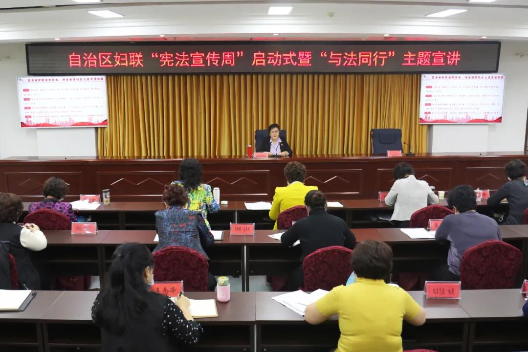 今年12月4日是第七個(gè)國家憲法日,也是我國第三個(gè)“憲法宣傳周”。今年的活動(dòng)主題為“深入學(xué)習(xí)宣傳習(xí)近平法治思想,大力弘揚(yáng)憲法精神”。為全面貫徹落實(shí)黨的十九屆五中全會(huì)精神和第三次中央新疆工作座談會(huì)精神,充分發(fā)揮婦聯(lián)組織的優(yōu)勢和作用,推動(dòng)憲法學(xué)習(xí)宣傳走入日常生活、走入干部群眾,11月30日, 自治區(qū)婦聯(lián)按照自治區(qū)黨委全面依法治疆委員會(huì)辦公室要求,舉辦了“憲法宣傳周”啟動(dòng)式暨“與法同行”主題宣講活動(dòng)。
