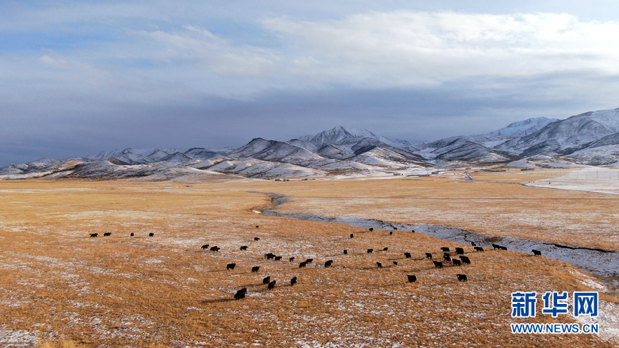 12月6日,牦牛在雪后的阿柔草原上活動(無人機照片)。新華社記者 張宏祥 攝