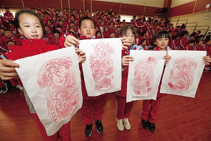 孩子們在展示木版年畫。