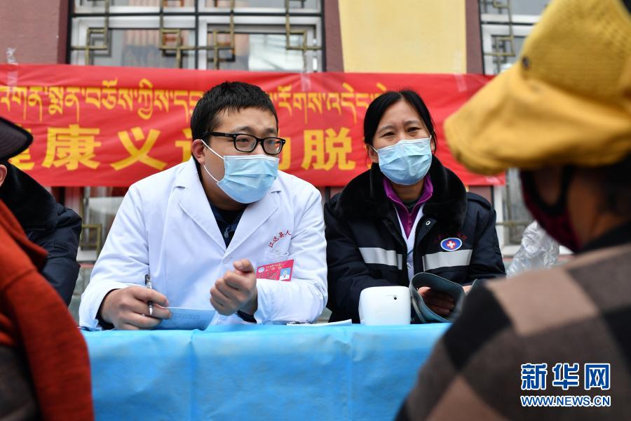 在西藏昌都市江達縣卡貢村,天津援藏醫(yī)生張宏(左)和李文茹為村民義診(9月26日攝)。新華社記者 詹彥 攝