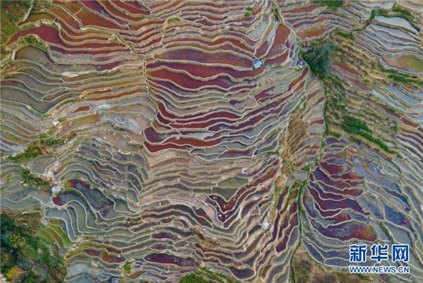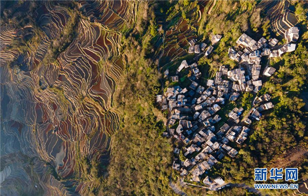 這是1月6日傍晚拍攝的哈尼梯田(無(wú)人機(jī)照片)。