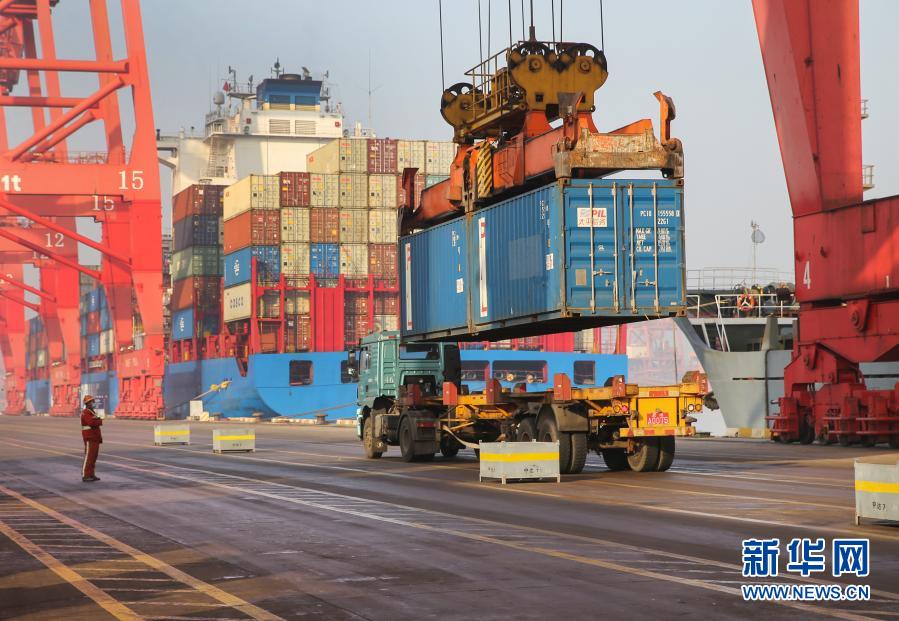 1月14日,在江蘇連云港港集裝箱碼頭,大型機械從集裝箱船舶上卸載貨物。新華社發(fā)(王健民 攝)