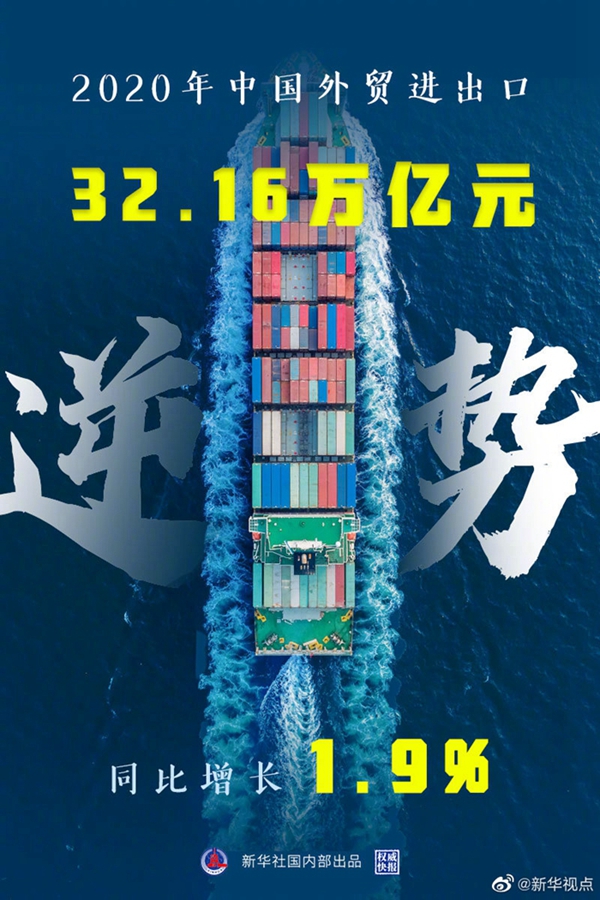 新華社北京1月14日電(記者劉紅霞)海關(guān)總署14日發(fā)布數(shù)據(jù),2020年我國貨物貿(mào)易進出口總值32.16萬億元,同比增長1.9%,在新冠肺炎疫情和單邊主義保護主義等多重壓力之下創(chuàng)歷史新高,成為全球唯一實現(xiàn)貨物貿(mào)易正增長的主要經(jīng)濟體。