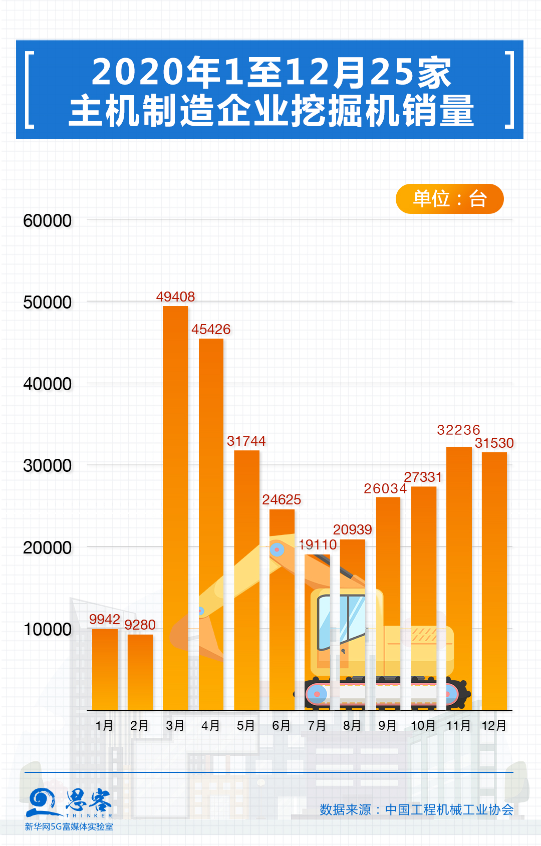 挖掘機(jī)銷量素有中國(guó)經(jīng)濟(jì)“溫度計(jì)”之稱。據(jù)中國(guó)工程機(jī)械工業(yè)協(xié)會(huì)統(tǒng)計(jì),2020年12月納入統(tǒng)計(jì)的25家挖掘機(jī)制造企業(yè)共銷售各類挖掘機(jī)31530臺(tái),同比增長(zhǎng)56.4%;全年共銷售挖掘機(jī)327605臺(tái),同比增長(zhǎng)39%。從百萬(wàn)億里程碑和挖掘機(jī)銷量增長(zhǎng)的背后,我們看到了怎樣的中國(guó)經(jīng)濟(jì)活力與圖景?