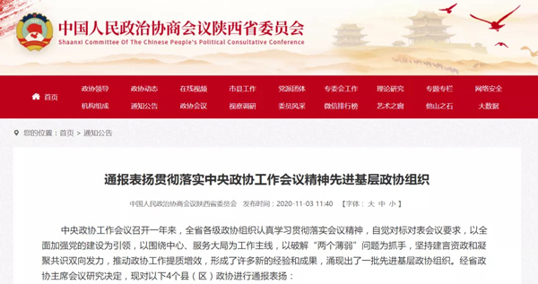 中央政協(xié)工作會(huì)議召開一年多來,陜西全省各級政協(xié)組織認(rèn)真貫徹落實(shí)會(huì)議精神,堅(jiān)持建言資政和凝聚共識(shí)雙向發(fā)力,推動(dòng)政協(xié)工作提質(zhì)增效,形成了許多新的經(jīng)驗(yàn)和成果,涌現(xiàn)出了一批先進(jìn)基層政協(xié)組織。2020年11月2日,省政協(xié)十二屆四十七次主席會(huì)議決定通報(bào)表揚(yáng)貫徹落實(shí)中央政協(xié)工作會(huì)議精神先進(jìn)基層政協(xié)組織,金臺(tái)區(qū)政協(xié)、富平縣政協(xié)、富縣政協(xié)和柞水縣政協(xié)4家縣(區(qū))政協(xié)組織榜上有名。
