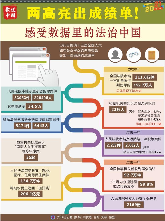 8日提請十三屆全國人大四次會議審議的兩高報告,交出一份滿滿的成績單。掃黑除惡“打傘破網(wǎng)”、嚴(yán)懲腐敗守護(hù)平安、加強(qiáng)民生司法保障……一串串?dāng)?shù)字勾勒出法治中國建設(shè)的亮點(diǎn)。