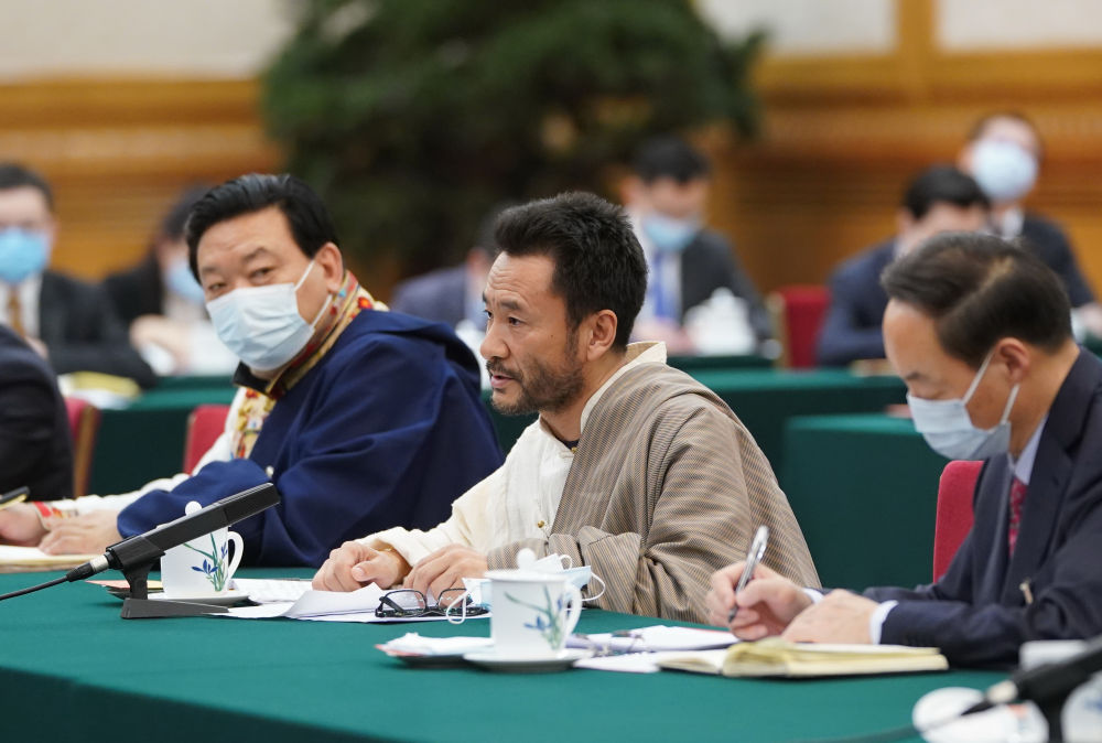 ↑ 3月7日,在參加十三屆全國人大四次會議青海代表團(tuán)審議時,扎西多杰就玉樹災(zāi)后重建新變化發(fā)言。新華社記者李學(xué)仁攝