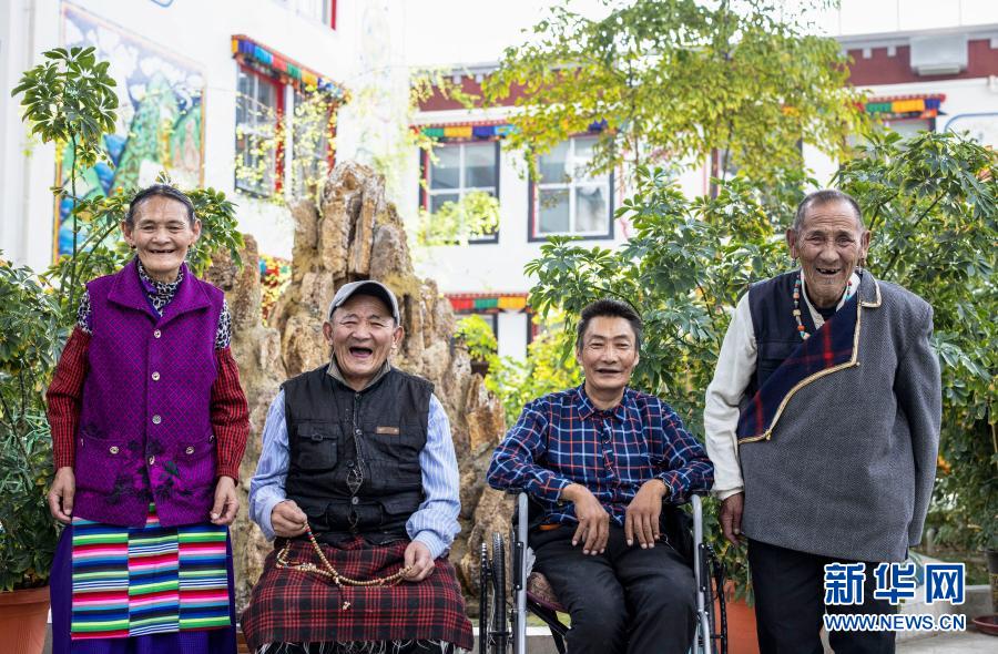 80歲的次旦(右一)在集中供養(yǎng)服務(wù)中心跟朋友們合影(3月19日攝)。