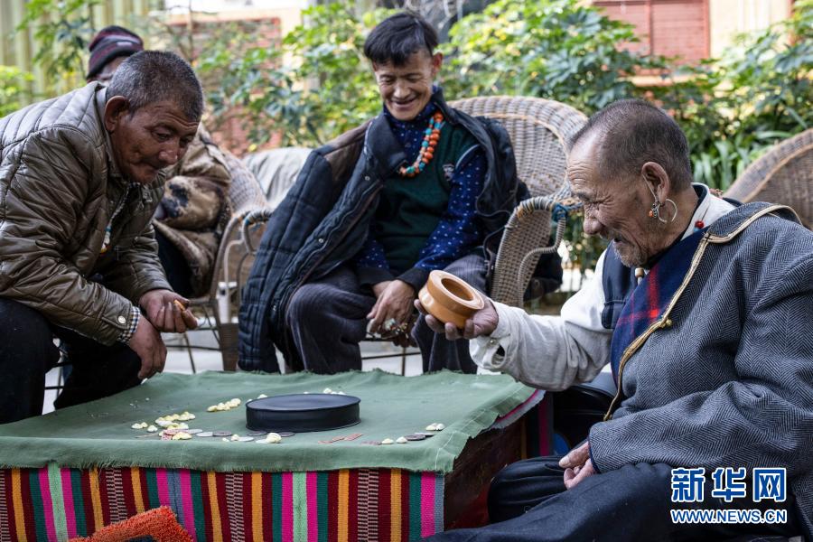 次旦(右)在集中供養(yǎng)服務(wù)中心和朋友們一起進(jìn)行娛樂(lè)活動(dòng)(3月19日攝)。