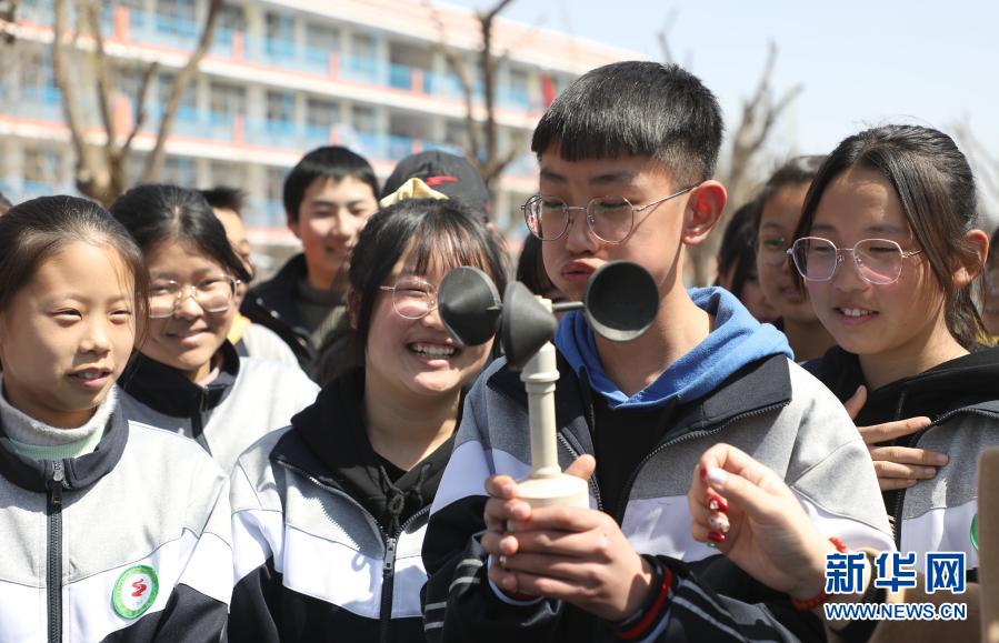 3月22日,山東省臨沂市沂南縣孫祖鎮(zhèn)中學(xué)一名學(xué)生在做風(fēng)速實(shí)驗(yàn)。新華社發(fā)(杜昱葆 攝)