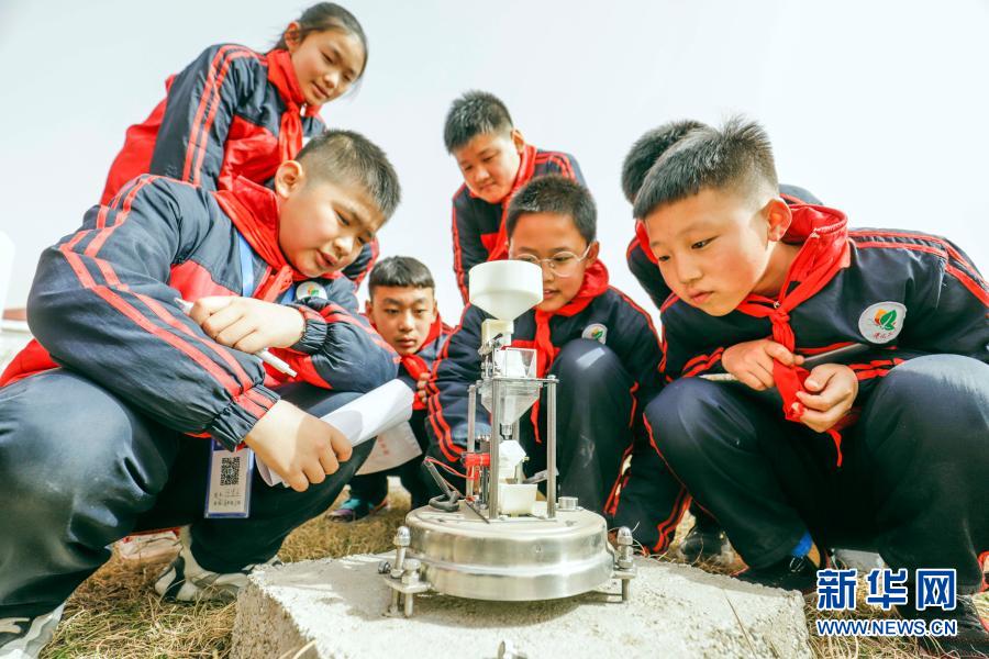 3月22日,在河北省遵化市氣象局監(jiān)測(cè)場(chǎng),小學(xué)生了解氣象監(jiān)測(cè)設(shè)備。新華社發(fā)(劉滿(mǎn)倉(cāng) 攝)