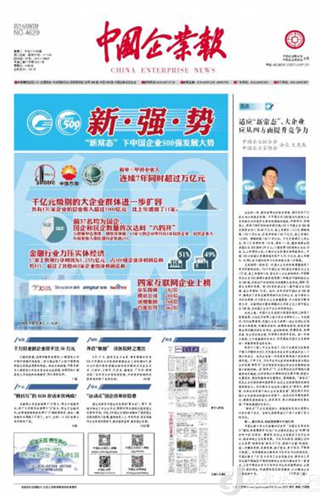 《中國(guó)企業(yè)報(bào)》是由中國(guó)企業(yè)聯(lián)合會(huì)、中國(guó)企業(yè)家協(xié)會(huì)主管主辦,是中國(guó)唯一以企業(yè)和企業(yè)家為報(bào)道核心的中央級(jí)媒體?!吨袊?guó)企業(yè)報(bào)》是一張專為中國(guó)企業(yè)創(chuàng)辦的報(bào)紙。1988年1月4日,由國(guó)家經(jīng)委主辦,中國(guó)企業(yè)管理協(xié)會(huì)承辦的《中國(guó)企業(yè)報(bào)》正式創(chuàng)刊。陳云同志為報(bào)紙題寫了報(bào)頭,鄧力群任報(bào)社名譽(yù)顧問(wèn),袁寶華任報(bào)社名譽(yù)社長(zhǎng)。從1988年創(chuàng)辦至今,秉承“面向企業(yè),為企業(yè)服務(wù)”的辦報(bào)宗旨,親歷和記錄著中國(guó)企業(yè)的改革進(jìn)程,同時(shí)伴隨著中國(guó)企業(yè)的發(fā)展壯大而不斷成長(zhǎng)。經(jīng)過(guò)20多年的實(shí)踐探索,在報(bào)道企業(yè)新聞、推動(dòng)企業(yè)改革、維護(hù)企業(yè)權(quán)益、促進(jìn)企業(yè)發(fā)展等方面,逐步形成了自身的風(fēng)格和特色,專業(yè)性、權(quán)威性日益得到了企業(yè)界和新聞界的認(rèn)同。