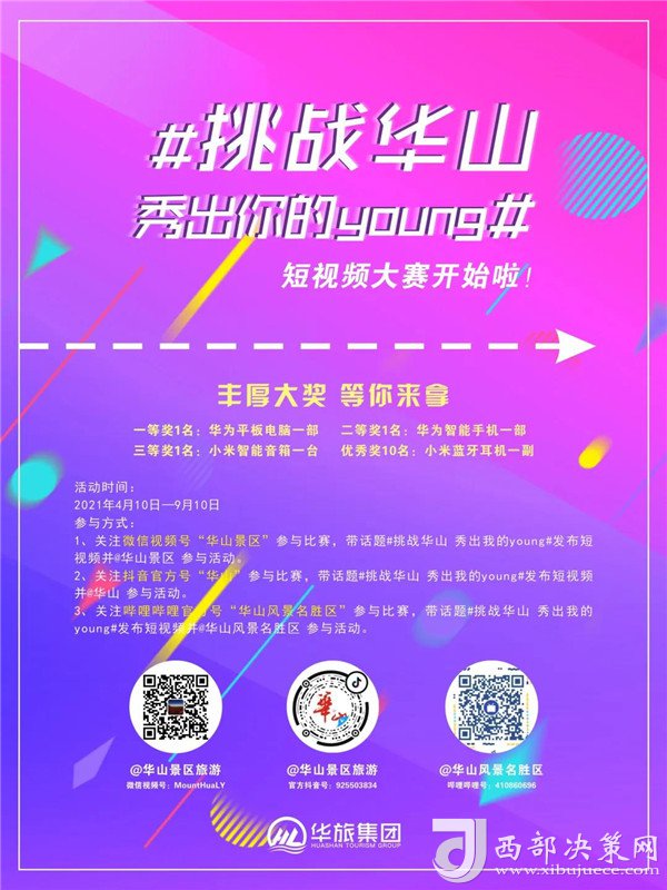 朝氣蓬勃的青年學(xué)生擁有敏銳的感受力和發(fā)現(xiàn)美的能力。為了進(jìn)一步挖掘華山獨(dú)特自然風(fēng)光及厚重的文化內(nèi)涵,激發(fā)大學(xué)生群體的創(chuàng)作才能,華旅集團(tuán)營(yíng)銷中心特向大學(xué)生推出“挑戰(zhàn)華山 秀出你的young”短視頻大賽,在比賽之余,可圍繞華山自然風(fēng)光、人文歷史、傳說(shuō)典故、道教文化等進(jìn)行創(chuàng)作,以年輕人的視角展示華山獨(dú)特之美,活動(dòng)自4月10日起,在微信視頻號(hào)(華山景區(qū))、抖音APP(華山)、嗶哩嗶哩(華山風(fēng)景名勝區(qū))等平臺(tái)正式啟動(dòng)。