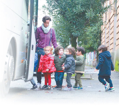 意大利羅馬一家幼兒園的小朋友們?cè)诶蠋煹慕M織下登上校車。 本報(bào)記者 韓 碩攝