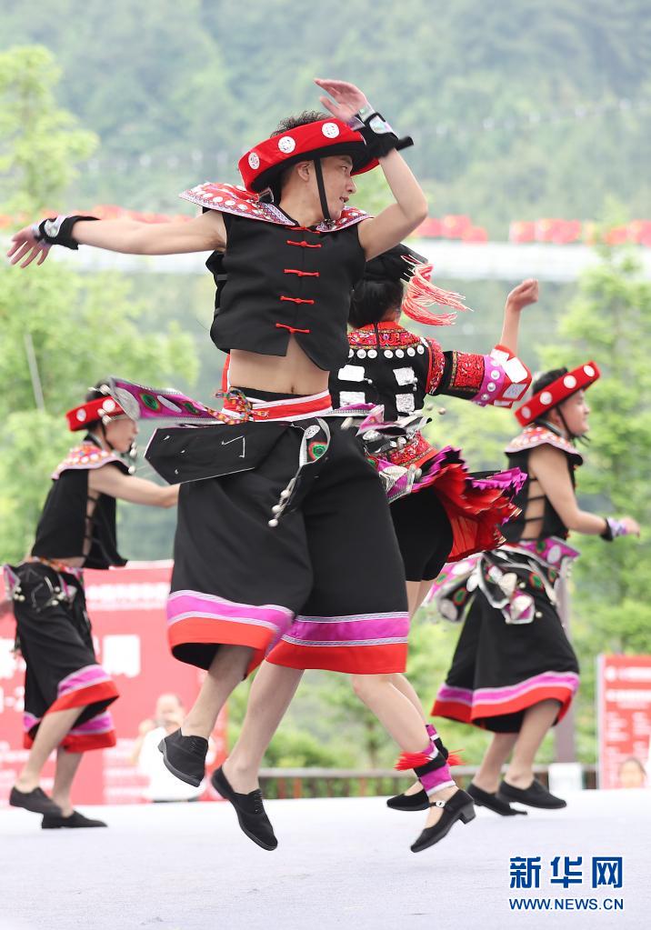 5月16日,演員在丹寨縣萬達小鎮(zhèn)非遺歌舞展演活動上表演苗族踩鼓舞。