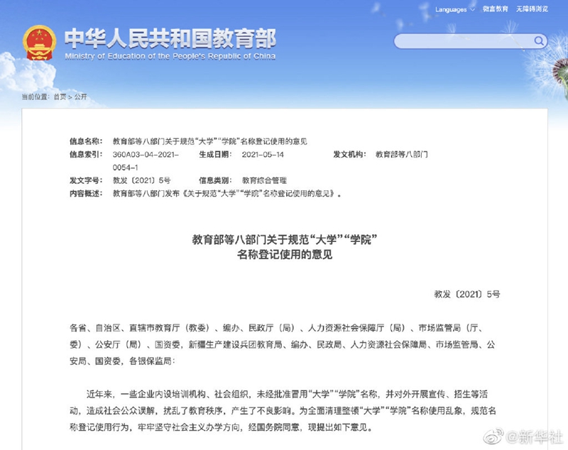 教育部等八部門近日印發(fā)意見(jiàn),規(guī)范大學(xué)學(xué)院名稱登記使用。教育部表示,一些企業(yè)內(nèi)設(shè)培訓(xùn)機(jī)構(gòu)、社會(huì)組織,未經(jīng)批準(zhǔn)冒用“大學(xué)”“學(xué)院”名稱,并對(duì)外開(kāi)展宣傳、招生等活動(dòng),造成社會(huì)公眾誤解,擾亂了教育秩序。意見(jiàn)明確,“大學(xué)”“學(xué)院”名稱經(jīng)審批方可使用。大學(xué)由國(guó)務(wù)院教育行政部門依法審批或備案;學(xué)院根據(jù)辦學(xué)層次、類型、法人性質(zhì)等,由中央和國(guó)家有關(guān)部門或省級(jí)人民政府及其有關(guān)部門依法審批。涉及機(jī)構(gòu)編制事項(xiàng)的,按照機(jī)構(gòu)編制管理權(quán)限和規(guī)定程序,報(bào)機(jī)構(gòu)編制部門審批。(記者胡浩)