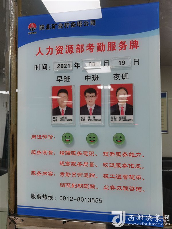 西部決策網(wǎng)訊 在黨史學(xué)習(xí)教育活動中,開展“我為群眾辦實事”實踐活動是公司黨史學(xué)習(xí)教育實施方案中的一項重點(diǎn)任務(wù)。為及時了解和掌握員工考勤動態(tài),妥善處理和解決好員工考勤中的難點(diǎn)問題,增強(qiáng)員工獲得感、幸福感、安全感,陜北礦業(yè)檸條塔公司人力資源部結(jié)合實際,把學(xué)黨史與為員工辦實事相結(jié)合,增設(shè)一面“考勤服務(wù)牌”。