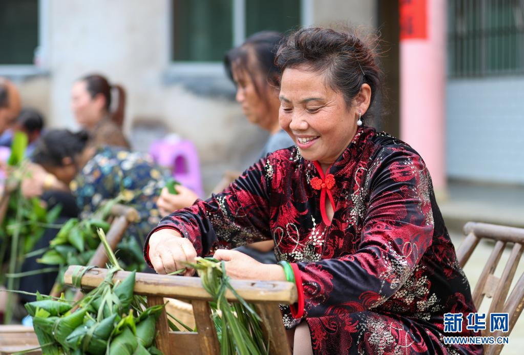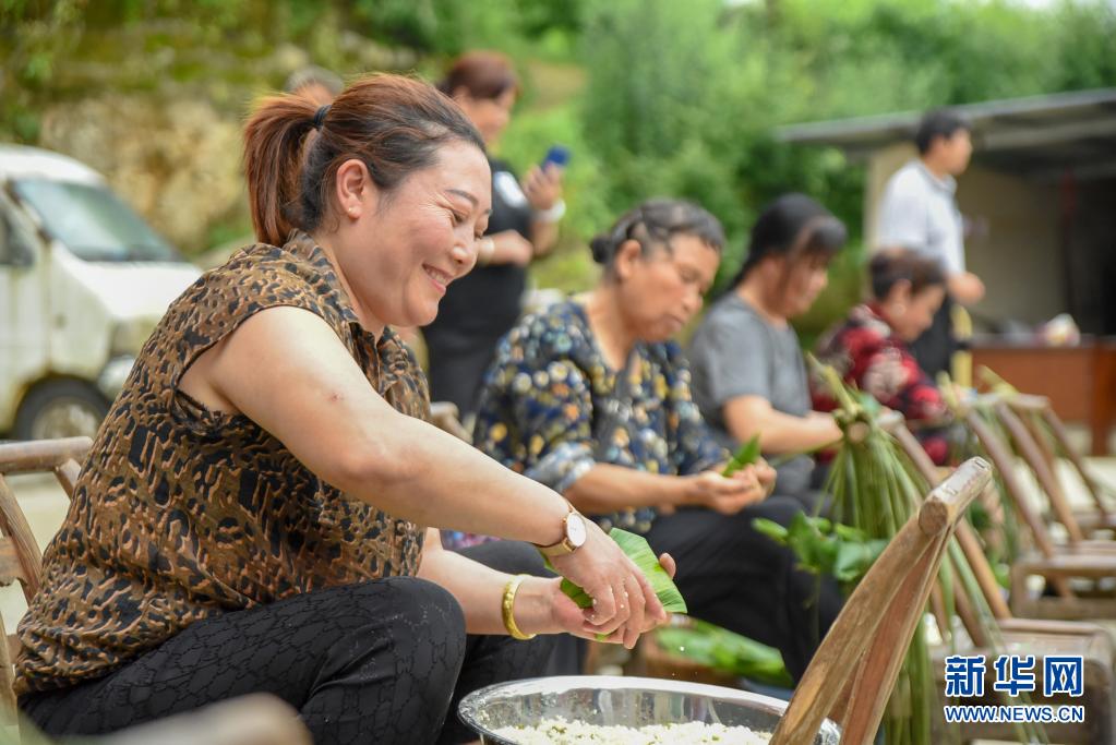 6月2日,貴州省銅仁市玉屏侗族自治縣亞魚鄉(xiāng)郭家灣村村民參加包粽子比賽。新華社發(fā)(李昆攝)