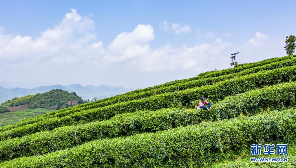 在貴州省六盤水市六枝特區(qū)落別鄉(xiāng),茶農在采茶(4月20日攝,無人機照片)。新華社記者 陶亮 攝