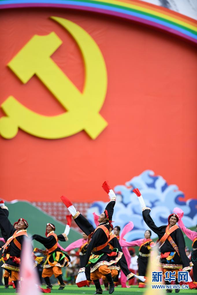 8月4日,當?shù)厝罕娫谟駱洳刈遄灾沃莩闪?0周年慶祝大會上表演節(jié)目。新華社記者 吳剛 攝