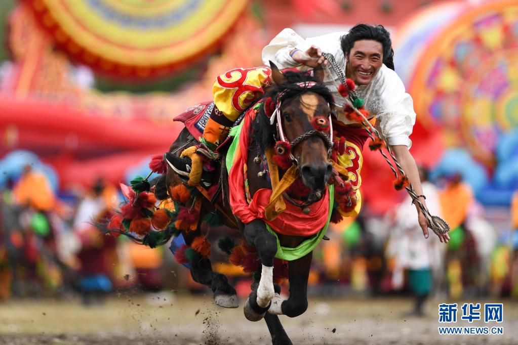 8月4日,當?shù)厝罕娫谟駱洳刈遄灾沃莩闪?0周年慶祝大會上表演傳統(tǒng)賽馬。新華社記者 吳剛 攝