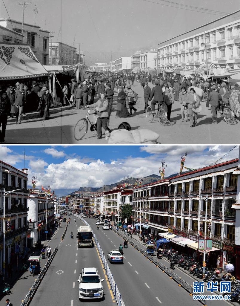 拼版照片:上圖是20世紀(jì)50年代的拉薩市八廓街(新華社記者王純德攝);下圖是2021年8月13日拍攝的拉薩市八廓街(新華社記者覺果攝)。新華社發(fā)