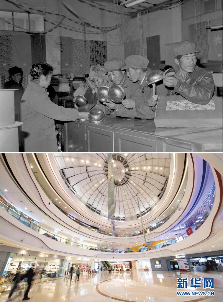拼版照片:上圖是20世紀(jì)80年代,人們?cè)诶_一家商店購(gòu)物(新華社發(fā) 劉麗嘉攝);下圖是2021年8月15日,人們?cè)诶_市萬達(dá)廣場(chǎng)購(gòu)物(新華社記者孫非攝)。新華社發(fā)