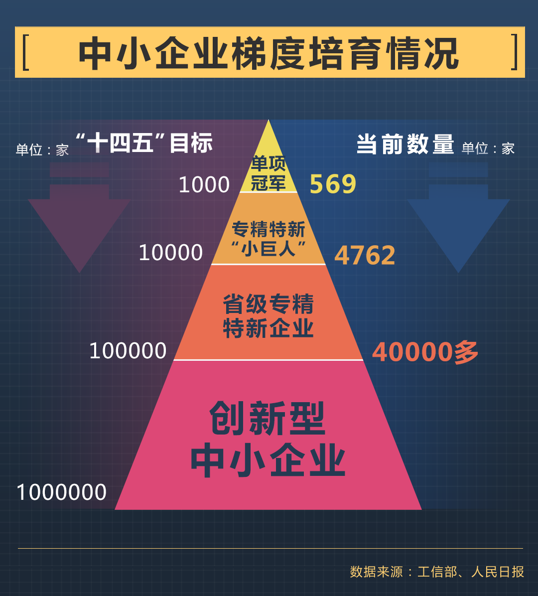 為了強化產業(yè)鏈韌性,工信部正在梯度培育優(yōu)質企業(yè)。“十四五”期間,我國將培育1萬家專精特新“小巨人”企業(yè),創(chuàng)新型中小企業(yè)將達到百萬家。“小巨人”是梯度培育體系中,推動中小企業(yè)由小到大、由大到強、由強變優(yōu)的關鍵交匯點。