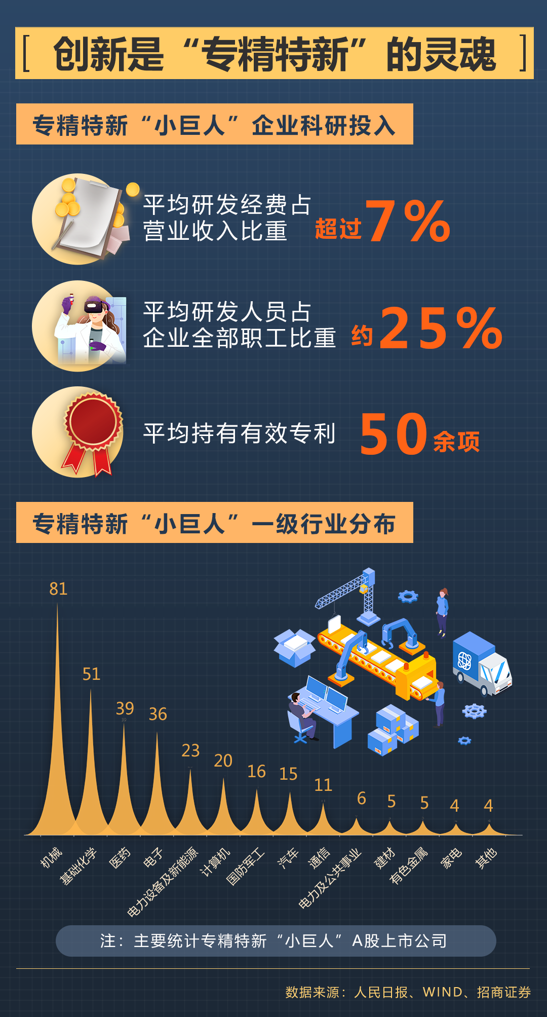 “小巨人”企業(yè)在多個關鍵領域為龍頭骨干企業(yè)配套,也在細分領域持續(xù)創(chuàng)新并占據(jù)市場領先地位。這些企業(yè)注重制造業(yè)細分領域的創(chuàng)新,在上天、入海、探月、高鐵等大國工程中,都能找到“小巨人”企業(yè)的產品。根據(jù)招商證券統(tǒng)計,A股上市的專精特新“小巨人”企業(yè)中,機械行業(yè)的占比最高,基礎化工、醫(yī)藥、電子等緊隨其后。