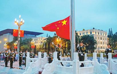 “向國旗——敬禮!”隨著國旗護衛(wèi)隊領(lǐng)隊發(fā)出響亮的口令,護旗隊員行舉槍禮。