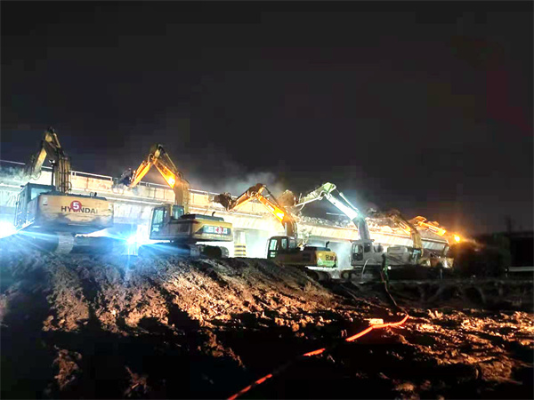 在施工現(xiàn)場(chǎng),隨著指揮員的一聲令下,50多臺(tái)設(shè)備齊裝上陣,轟隆作業(yè)。由于該兩座橋同時(shí)上跨京滬高速公路,現(xiàn)場(chǎng)作業(yè)空間有限。為確保此次拆橋任務(wù)安全順利進(jìn)行,同時(shí)降低施工影響,京滬高速公路HA4標(biāo)項(xiàng)目部對(duì)施工現(xiàn)場(chǎng)進(jìn)行詳細(xì)調(diào)查,多次組織召開專家施工方案評(píng)審會(huì),反復(fù)論證,細(xì)化橋梁拆除方案,精準(zhǔn)把控施工計(jì)劃;項(xiàng)目部領(lǐng)導(dǎo)班子和管理人員,全稱盯控,確保拆除工作萬(wàn)無(wú)一失。