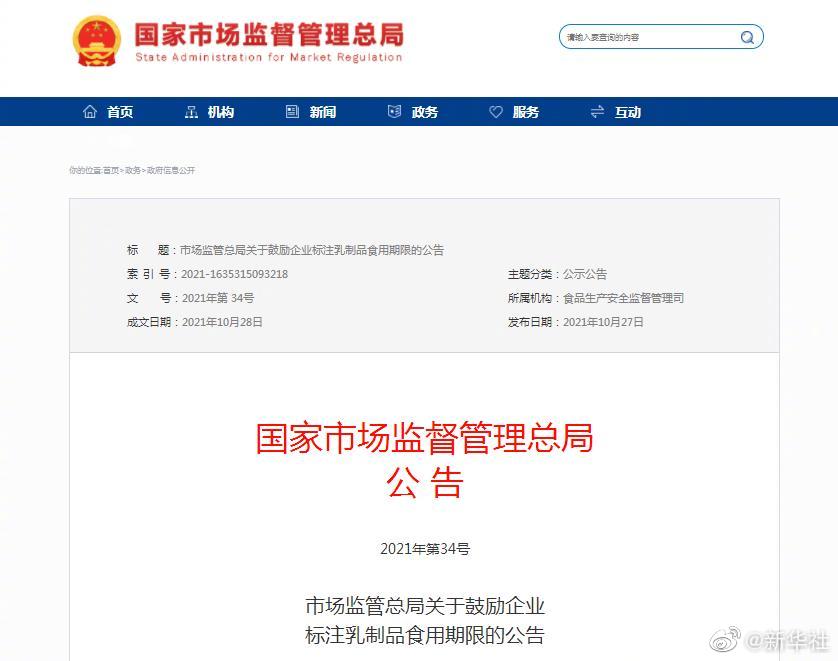 為方便消費(fèi)者識別乳制品的食用期限,避免食物浪費(fèi),市場監(jiān)管總局28日發(fā)布關(guān)于鼓勵企業(yè)標(biāo)注乳制品食用期限的公告,鼓勵食品生產(chǎn)企業(yè)生產(chǎn)的需冷藏保存的巴氏殺菌乳、發(fā)酵乳,在標(biāo)明生產(chǎn)日期的基礎(chǔ)上,明確標(biāo)注保質(zhì)期到期日,如“保質(zhì)期至XXXX年XX月XX日”“請于XXXX年XX月XX日前食(飲)用”等。按照食品安全法規(guī)定,食品標(biāo)簽應(yīng)當(dāng)標(biāo)注生產(chǎn)日期、保質(zhì)期。(記者趙文君)