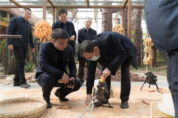 在上古農(nóng)耕文化、現(xiàn)代農(nóng)業(yè)科技與地方特色農(nóng)業(yè)相結合的神農(nóng)百草園里,高廳長饒有興趣的親自體驗農(nóng)事活動的玉米脫粒。調(diào)研組一行還參觀了各項高科技栽培種植及研學課堂區(qū)域。