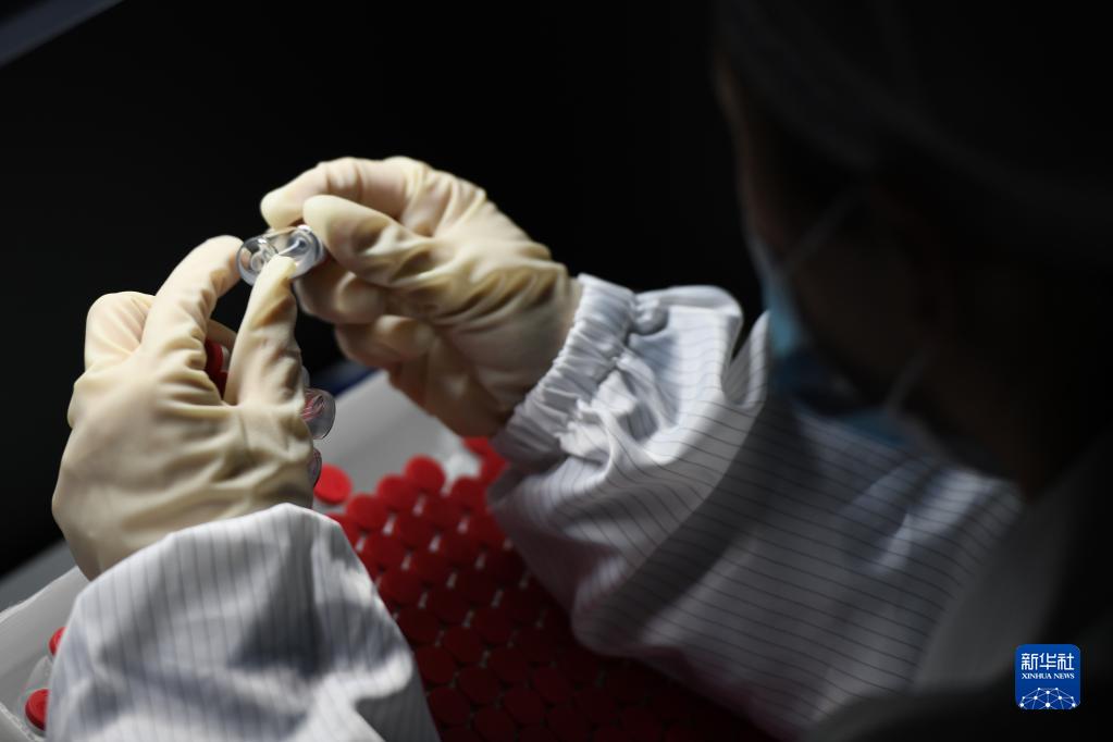 在安徽智飛龍科馬生物制藥有限公司新冠疫苗生產(chǎn)線上,工作人員對疫苗進行人工檢測(5月20日攝)。新華社記者 黃博涵 攝