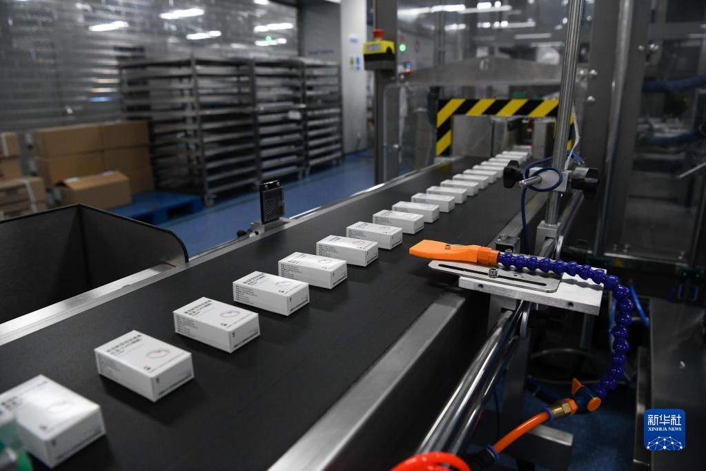在安徽智飛龍科馬生物制藥有限公司新冠疫苗生產(chǎn)線上,工作人員對疫苗進行包裝(5月20日攝)。新華社記者 黃博涵 攝