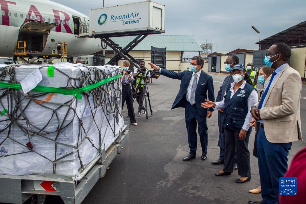 盧旺達(dá)衛(wèi)生部長(zhǎng)達(dá)尼埃爾·恩加米杰(右一)等官員在基加利國(guó)際機(jī)場(chǎng)查看該國(guó)首批通過COVAX計(jì)劃收到的新冠疫苗(2021年3月3日)。新華社發(fā)(西里爾·恩德格亞攝)