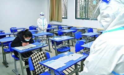 12月25日,西安外國語大學(xué)考點(diǎn)隔離考區(qū),監(jiān)考人員在單人隔離考場監(jiān)考。新華社記者 劉瀟攝