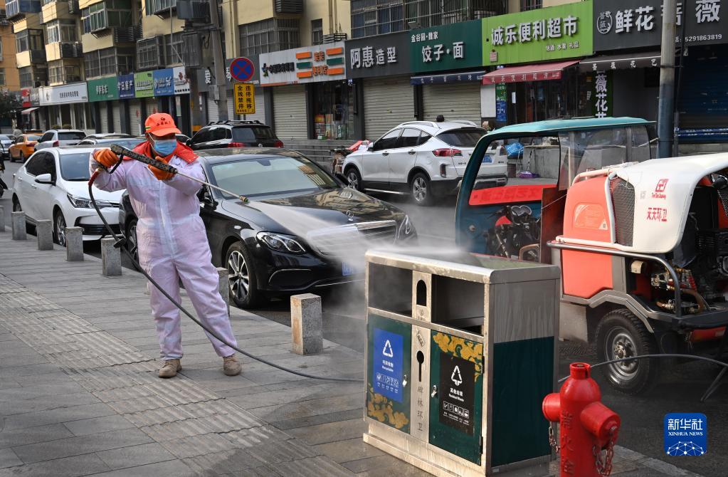 12月28日,環(huán)衛(wèi)人員在西安市文藝路對垃圾桶進行消殺。新華社記者 陶明 攝