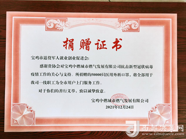 西部決策網(wǎng)訊 (任書彥)12月24日,寶雞市退役軍人就業(yè)創(chuàng)業(yè)促進(jìn)會(huì)向?qū)氹u中燃城市燃?xì)獍l(fā)展有限公司無償捐贈(zèng)醫(yī)用外科口罩50000只,以全力支持寶雞市抗疫防疫工作。