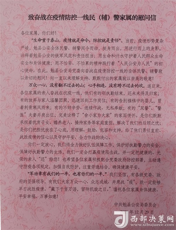 西部決策網(wǎng)訊為表達(dá)對(duì)奮戰(zhàn)在疫情防控一線(xiàn)民輔警家屬的崇高敬意,感謝他們對(duì)公安工作的理解和支持,12月29日下午,勉縣公安局組織開(kāi)展疫情防控一線(xiàn)民輔警家屬慰問(wèn)活動(dòng),為家屬們送去慰問(wèn)信和慰問(wèn)品,并通過(guò)他們向奮戰(zhàn)在一線(xiàn)的民輔警傳遞勉縣公安局黨委的溫暖和關(guān)愛(ài),以更加飽滿(mǎn)的熱情、昂揚(yáng)的斗志投入到疫情防控工作中。