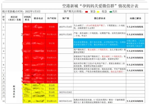 據悉,截至2022年1月6日,空港“孕媽媽”關愛群已經為群內的64位孕婦解決相關訴求百余件,并詳細記錄每一位孕婦的地址、聯(lián)系方式、預產期和相關訴求。同時,還為部分其他區(qū)縣的孕婦提供健康咨詢服務。